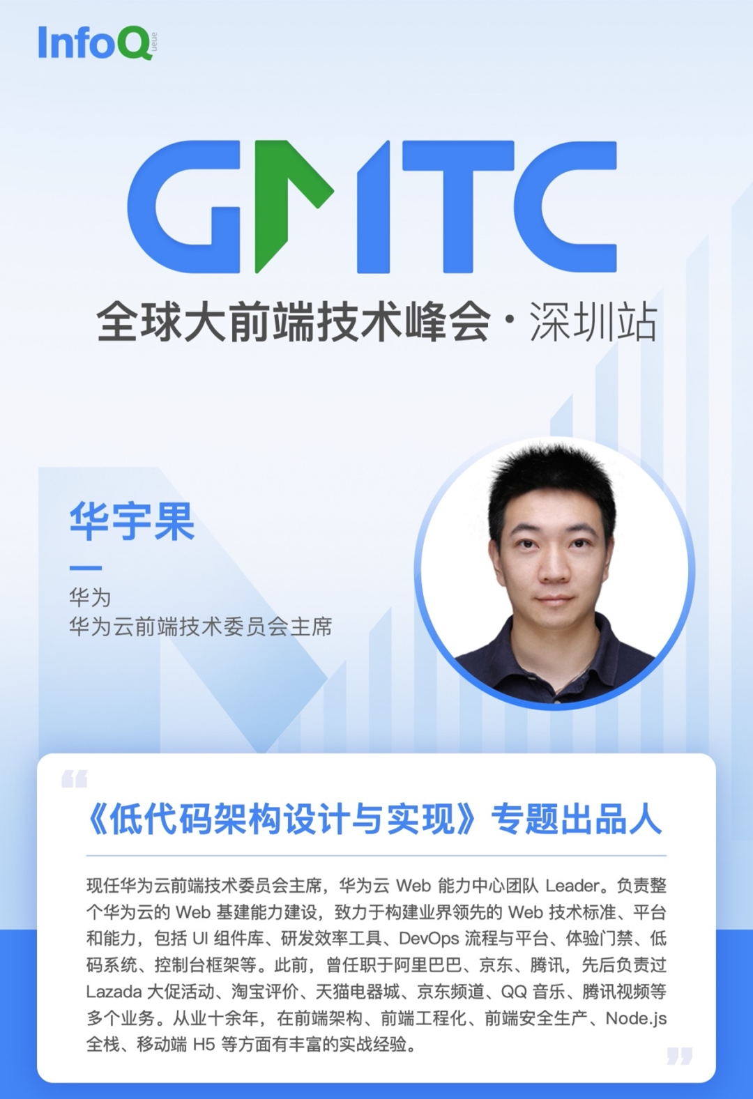 为给大家提供更多的借鉴和思考,12 月 5-6 日,GMTC 全球大前端技术大会(深圳站)2021 策划【低代码架构设计与实现】专题,邀请了华为云前端技术委员会主席华宇果担任出品人,并亲临现场,与大家一起聚焦底层低代码核心架构实现,如组件加载与嵌套机制、页面容器渲染、实时预览、插件化架构、跨端生成、自然布局、高低代码混合开发等内容,干货满满。
