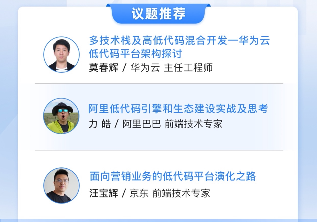 在层层打磨和筛选后,我们确定邀请了华为云主任工程师莫春辉老师、阿里巴巴前端技术专家力皓老师,以及京东前端技术专家汪宝辉老师,与大家一起从多技术栈及高低代码混合开发、低代码引擎、面向营销业务的低代码平台三个不同方面探索低代码架构的设计与实现。