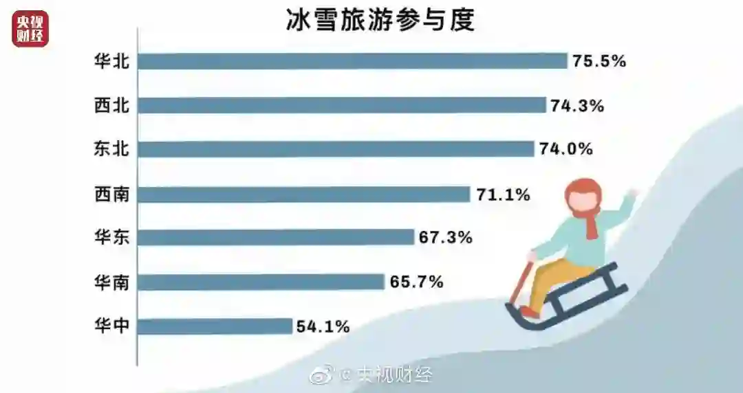央视调查发现,全国冰雪旅游的整体参与率达7成。华北地区在冰雪旅游方面的参与度最高,达75.5%;其次是西北地区,参与度为74.3%。参加过冰雪旅游的消费者中,6成以上参加过1-2次冰雪旅游,3成参加过3-4次冰雪旅游。(央视财经)