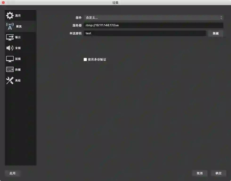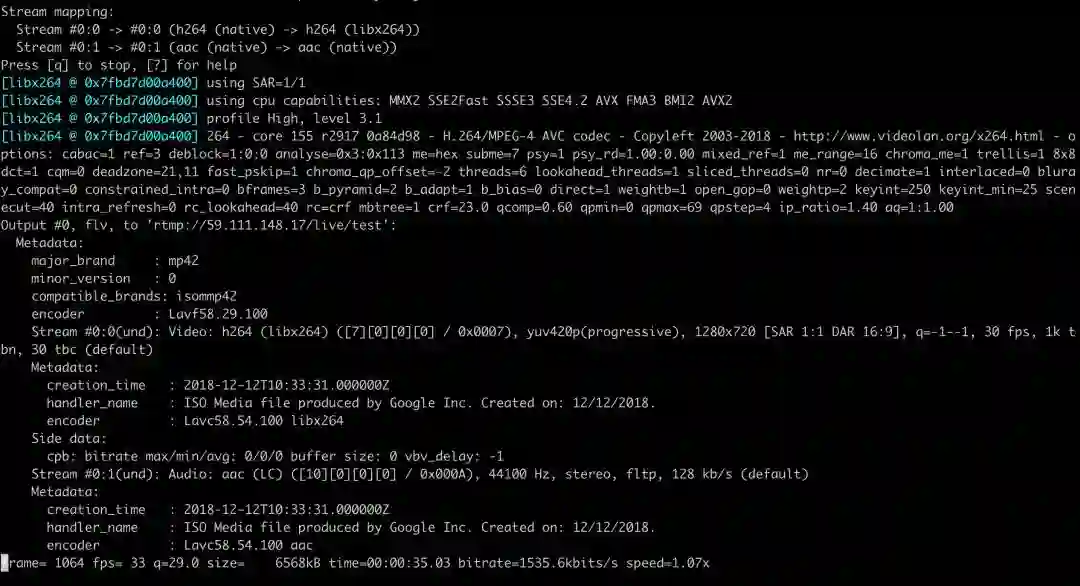 ffmpeg -i test.mp4 -vcodec libx264 -acodec aac -f flv rtmp://IP地址/live/test