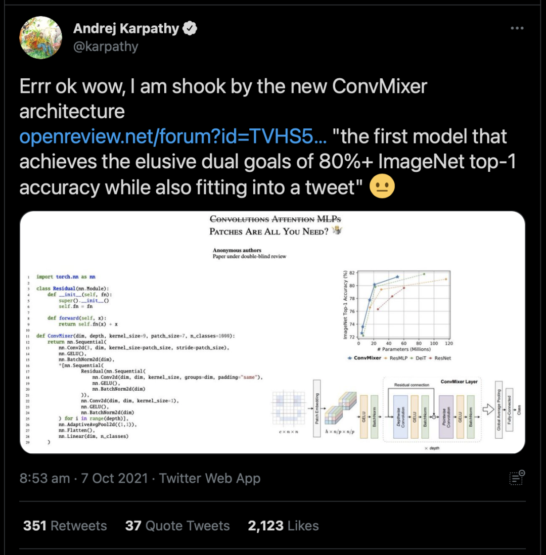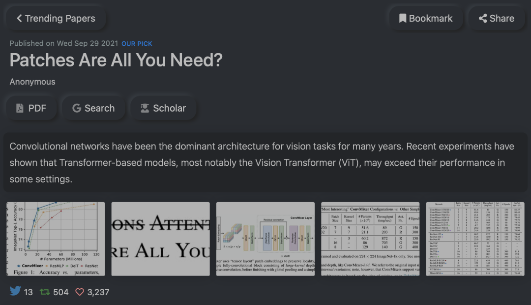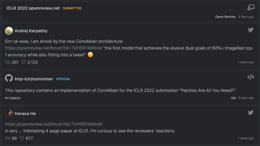 就拿很火的《Patches Are All You Need》来说吧,13条推文,504个转发,3237个点赞。