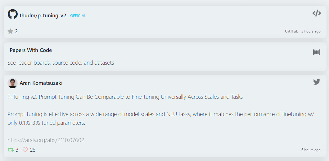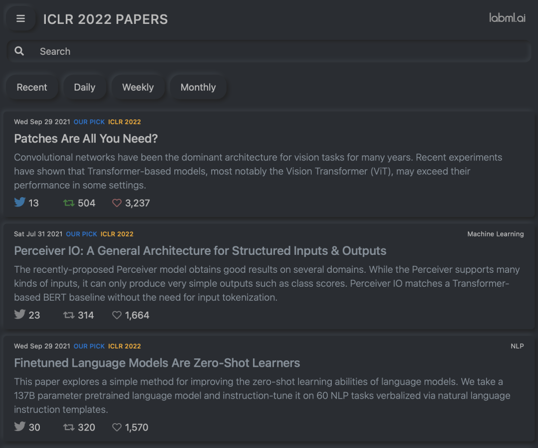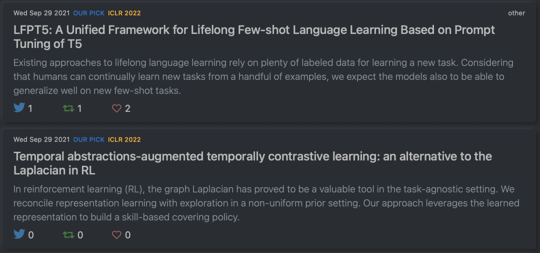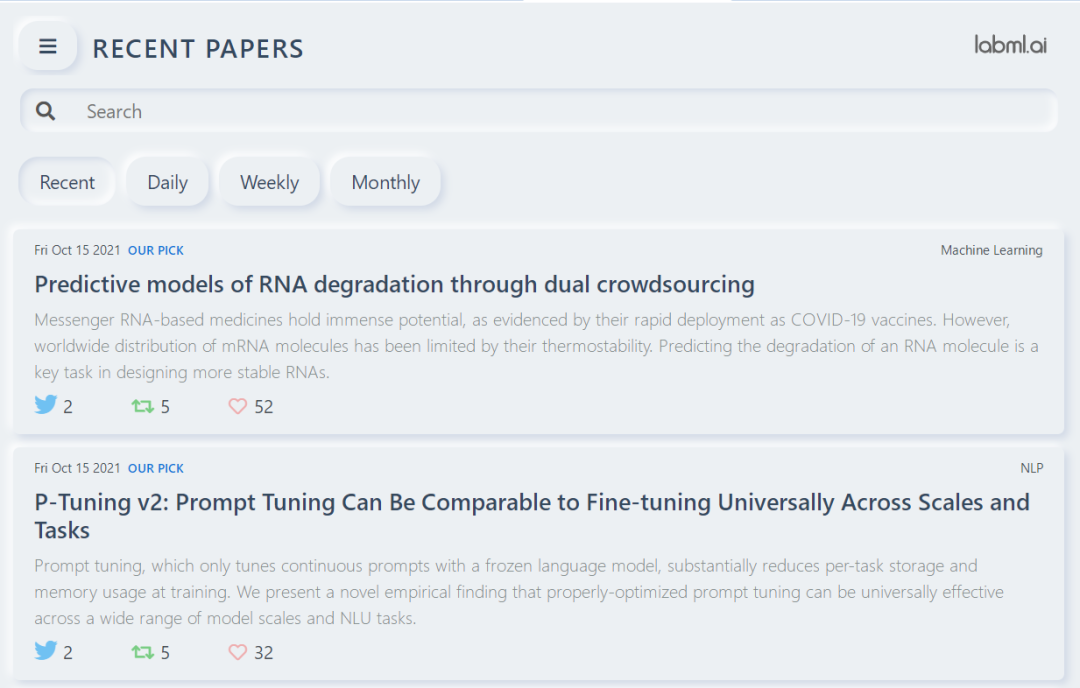 每篇论文都统计了相关的推文数、转发数和点赞数,以便用户可以过滤掉随机论文。
