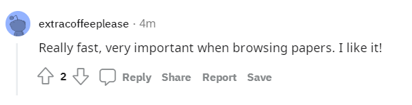 「真的很快!看论文的时候有这个东西太666了。我很喜欢!」。