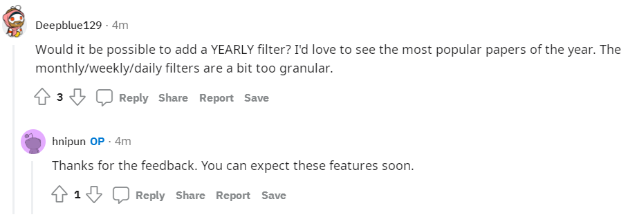有网友问:「能不能加一个『年度』筛选?我很想看到一年中最受欢迎的论文。」