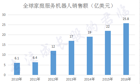 2016 年全球家庭服务机器人总销售额为25.8亿美元,同比增长17.3%。