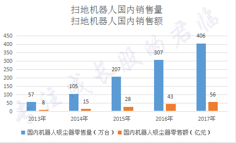 2017年,我国机器人吸尘器年销售额56亿元,年销售量406万台。