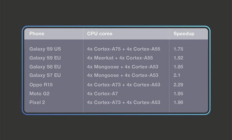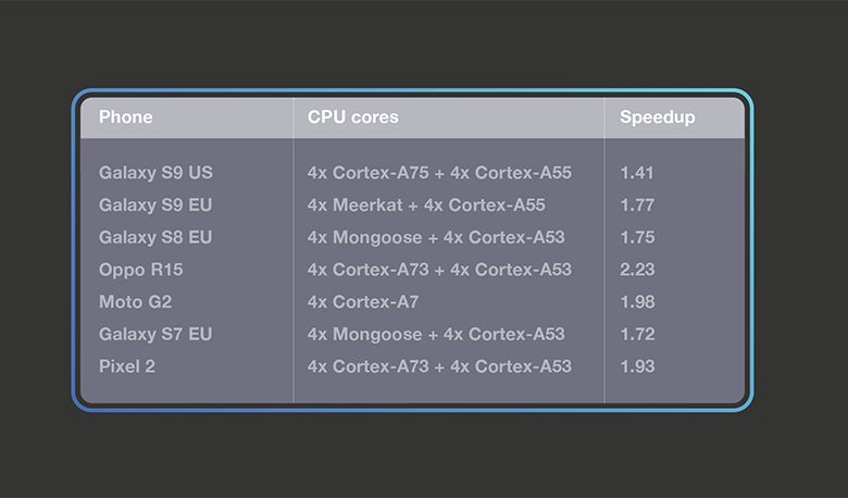 QNNPACK 已经帮助 Facebook 的 app 在全世界的移动设备中部署人工智能。研究者正在尝试进一步提升 QNNPACK 的性能,包括 FP16 格式的低精度计算,利用 NEON 点积(VDOT)和 16-bit 累积(16-bit accumulation)来使移动设备上的 AI 更加轻便。