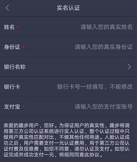 要在“趣步”实名认证,需要上传身份证号、银行卡、支付宝账号、本人照片、电话。虽然这些信息传到了一个陌生的App上面,几乎等同于在网络裸奔,但咱认了。