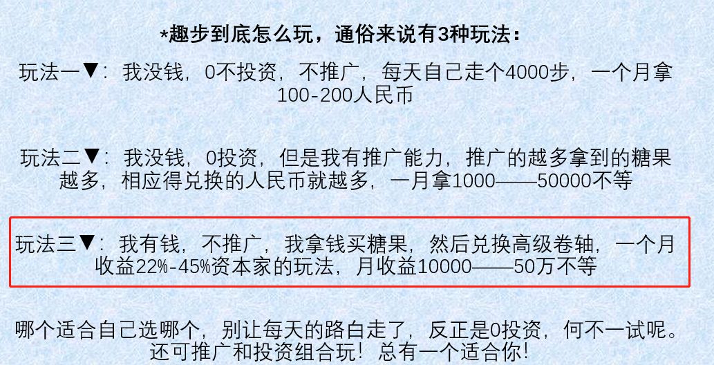 前面提到过,趣步宣传的时候,是这样说的:“每天正常走路,一年下来至少收入5000元;如果参与投资,一年躺赚50万。”