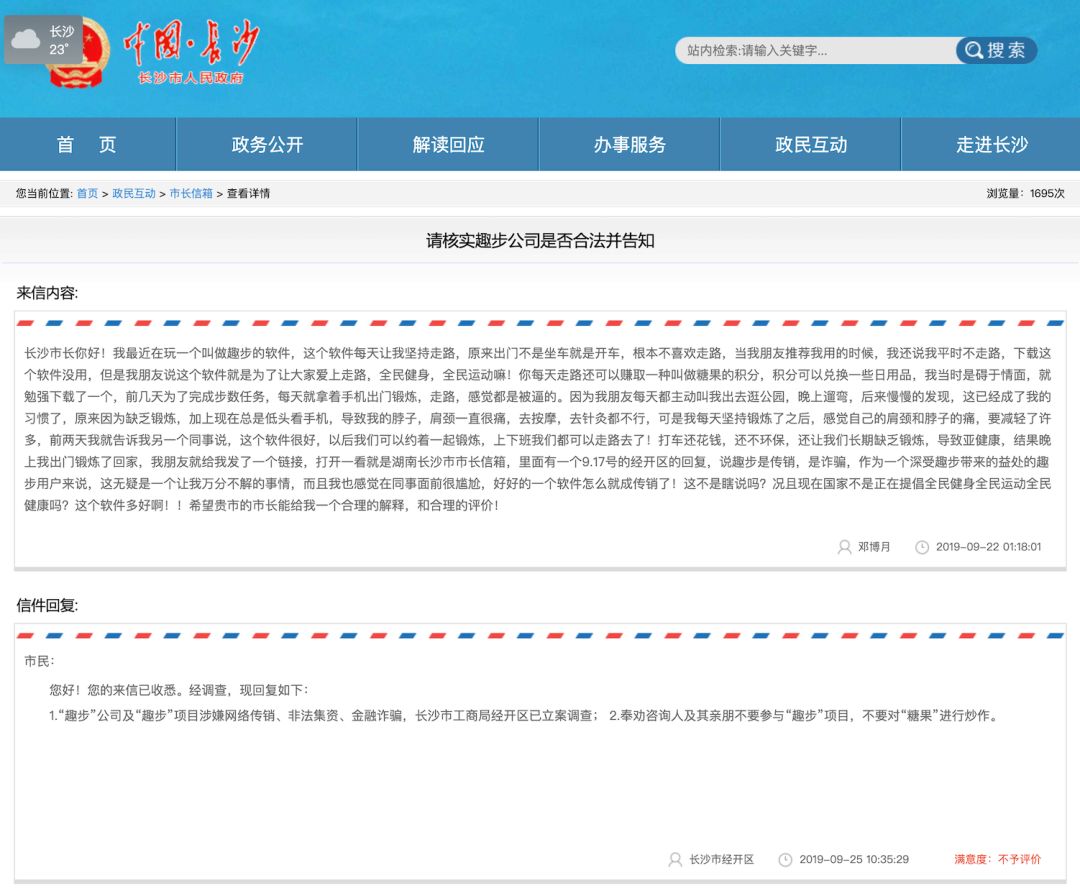 从今年7月2日至今,长沙市人民政府的官方网站上,针对趣步涉嫌违规、传销的问题致信市长信箱的市民问询信共有17封。