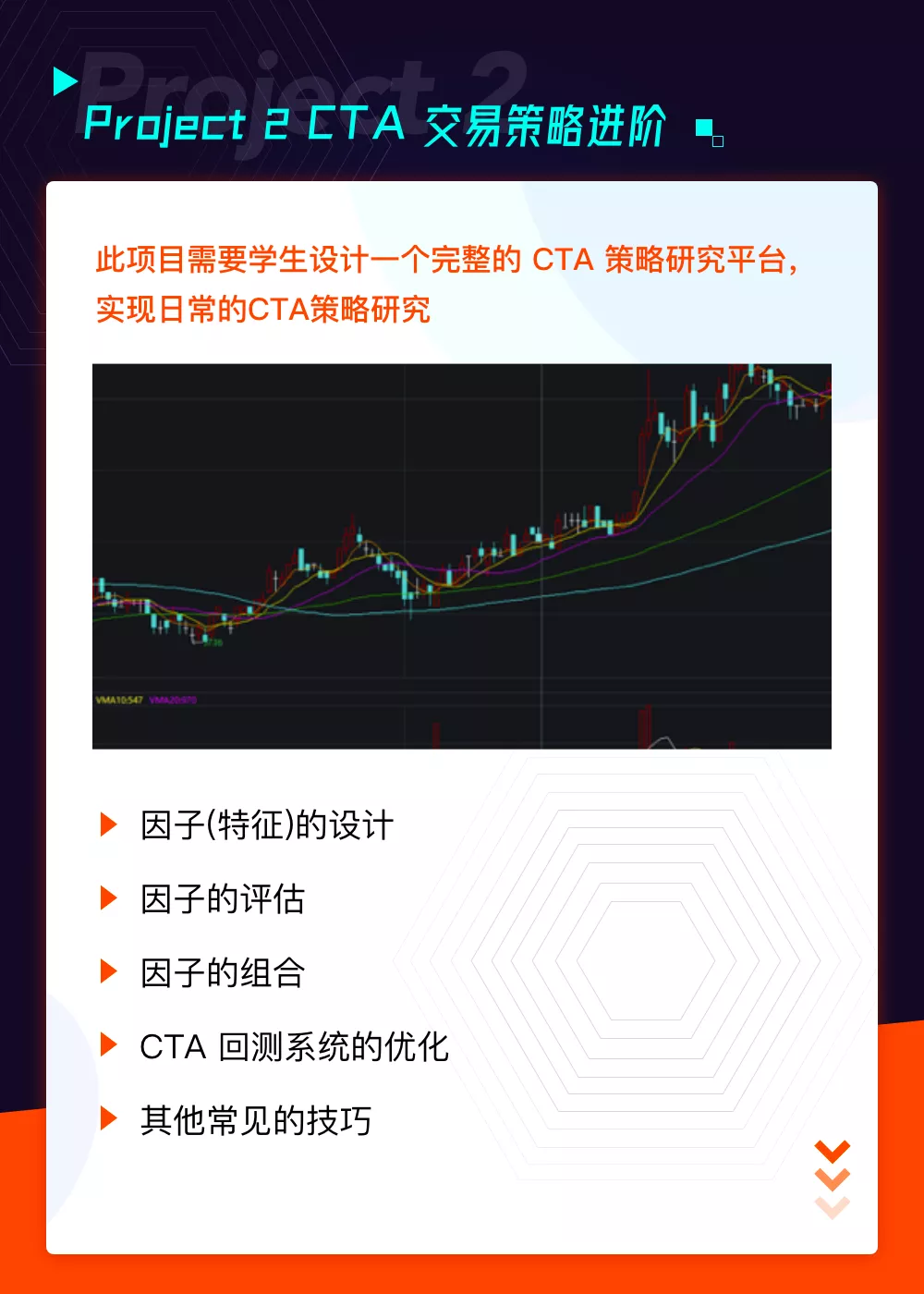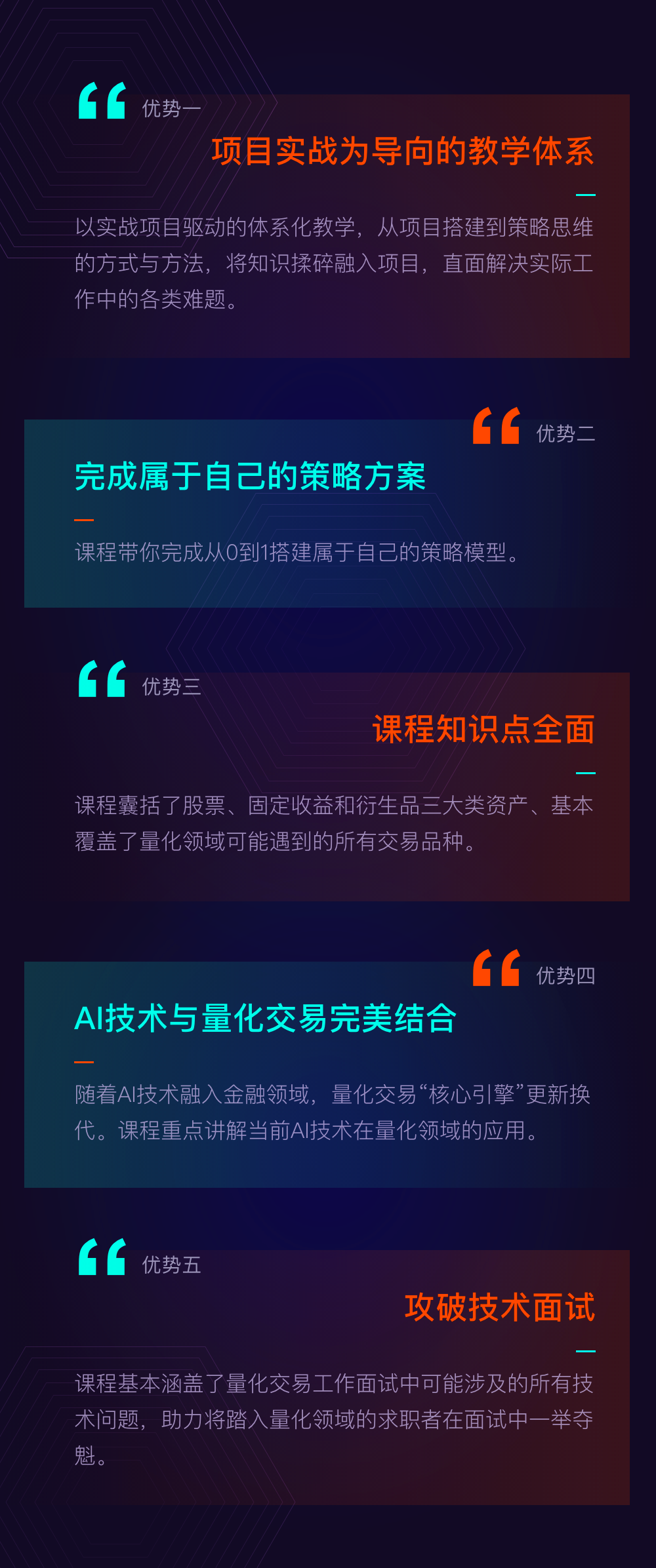 课程采用企业级真实项目,每个模块都有企业级别难度的综合项目练习,将知识揉碎融入企业级真实项目中,把 AI 的前沿技术应用到量化领域中。学员通过项目练习,融会贯通量化交易知识,直面实际工作中可能遇到的各类问题并加以解决。