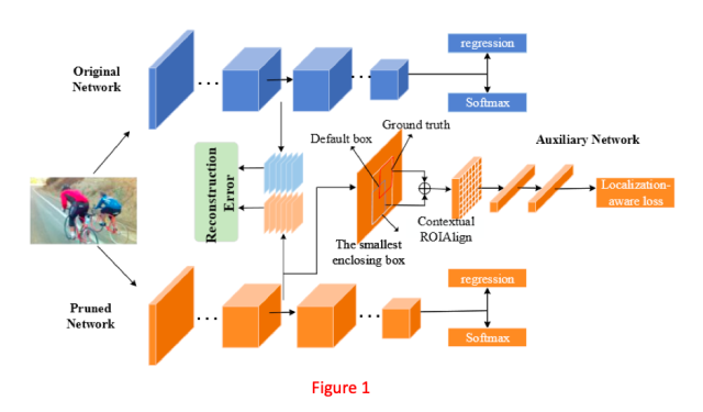 论文提出了一种定位感知的辅助网络,该网络可以让我们直接进行通道修剪以进行目标检测。首先论文设计了具有上下文感知的ROIAlign层的辅助网络,该层可以通过像素对齐获得默认框的精准位置信息,并在剪枝网络浅层时扩大默认框的感受野。然后,论文构造了一个用于目标检测的损失函数,该函数倾向于保留包含分类和回归关键信息的通道。