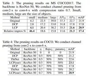 在MSCOCO上,基于ResNet-50的SSD剪枝掉了70%的参数,而精度下降幅度不大,在相同剪枝幅度下表现出了SOAT性能。