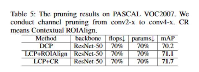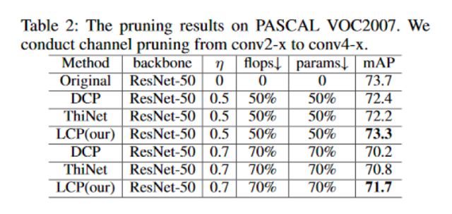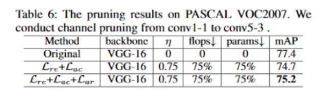 在PASCAL VOC上,本文将VGG-16从conv1-1剪枝到conv5-3,压缩率为0.75,速度快4倍。