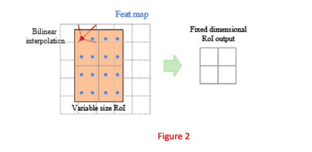 ROAlign层使用双线性插值法计算每个ROI四个规定采样点的真实值,随后对这四个点使用平均或最大池化。