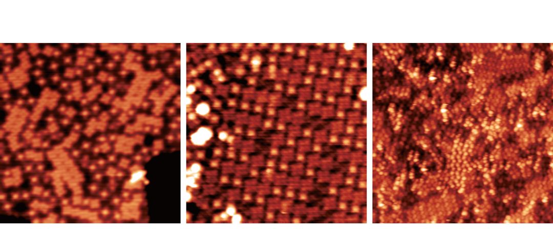 仅为0.6个分子厚度(左)、1.0个分子厚度(中)、1.9个分子厚度(右)的有机层的扫描隧道显微镜图像 。(图片来源:Isshiki et al.)