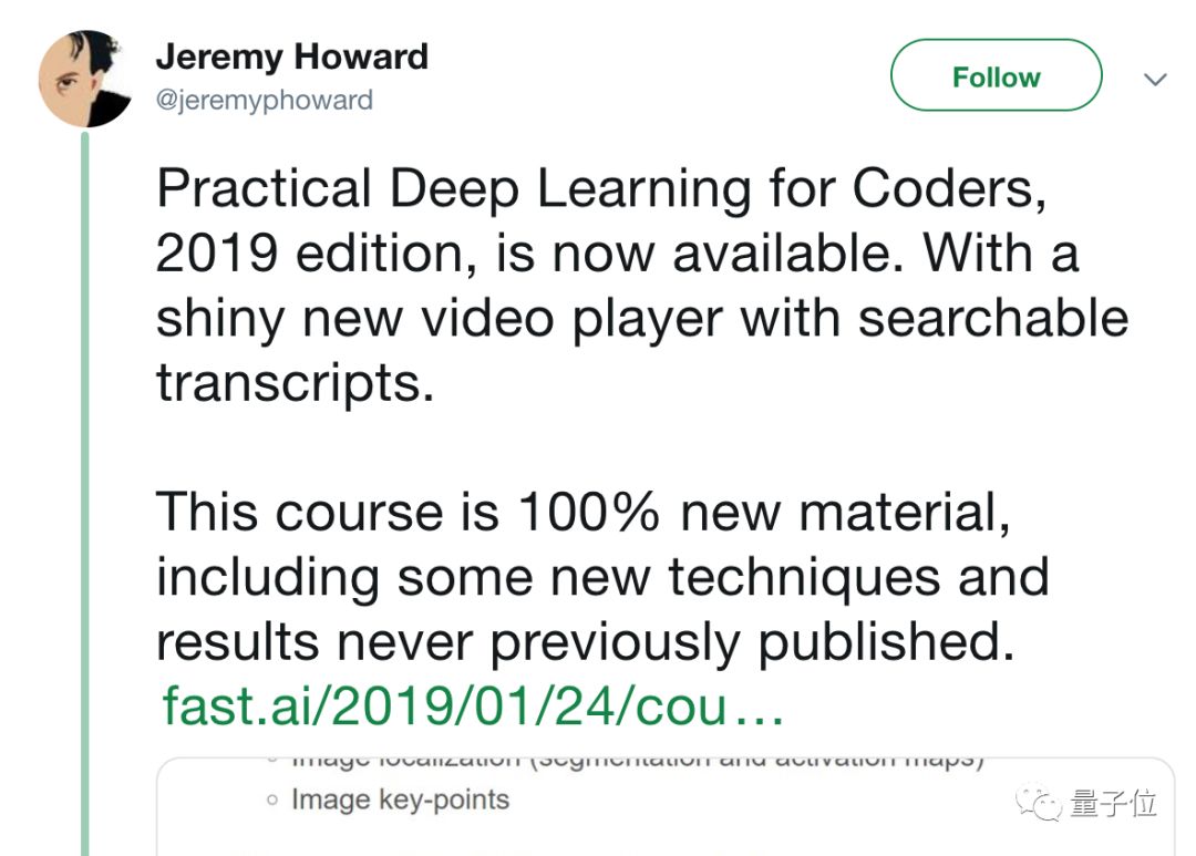 国外最受好评、理论+实践相结合、完全免费的AI课程——“给程序员的实践深度学习课”,刚刚上线了全新的2019版!
