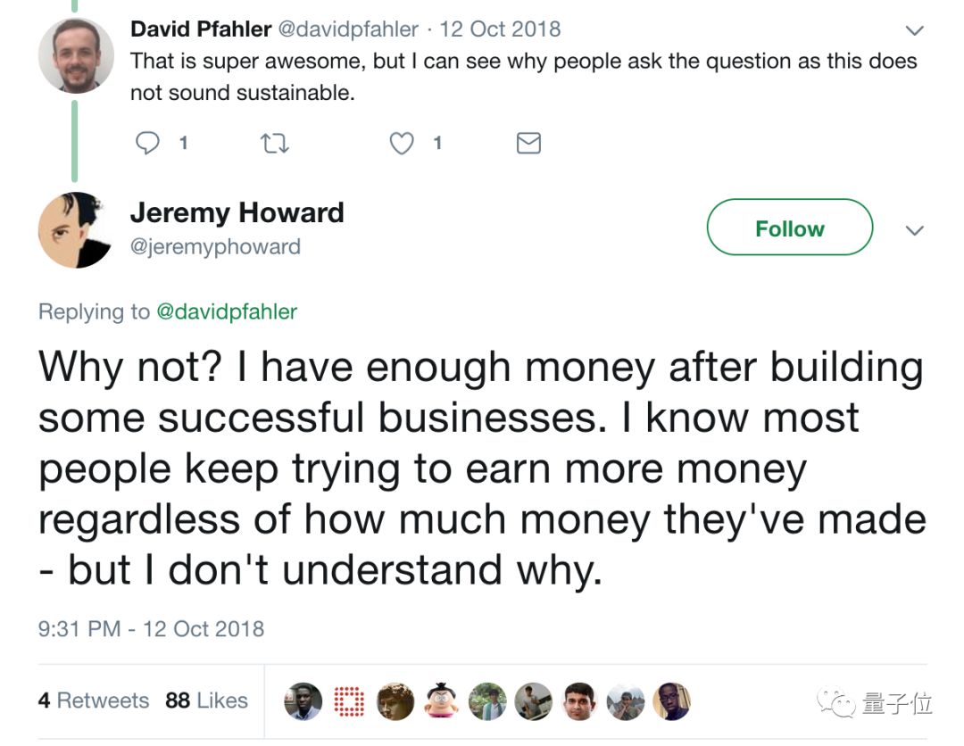 Jeremy曾经说:“我们的商业模式就是:花自己个人的钱做点事情,帮人使用深度学习。”有人担心“商业模式”不可持续的时候,Jeremy还硬怼了回去:
