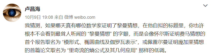 卢昌海猜测,如果哪天真有哪位数学家证明了黎曼猜想,在他自拟的标题里,你也许根本不会看到最耸人听闻的 “黎曼猜想” 的字眼,而是会像怀尔斯证明费马猜想的首个报告取名为 “模形式、椭圆曲线及伽罗瓦表示”,或佩雷尔曼证明庞加莱猜想的首篇论文取名为 “里奇流的熵公式及其几何应用” 那样的低调。