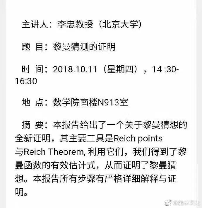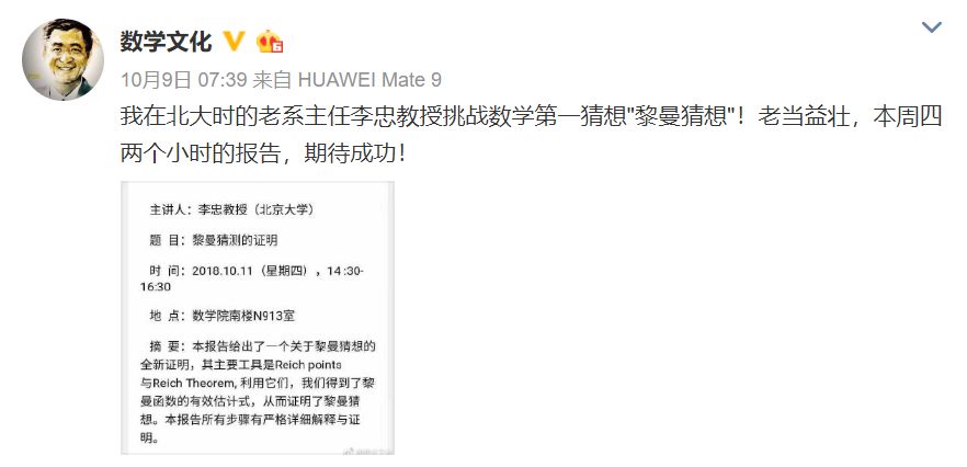 10 月 9 日,南方科技大学副校长汤涛教授在微博上转发一则公告,称北京大学的李忠教授将在 10 月 11 日挑战“黎曼猜想”。