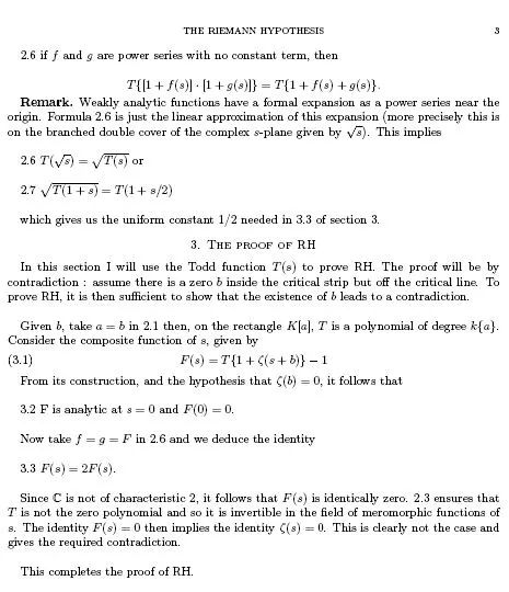 至于那篇题为 “黎曼猜想” (The Riemann Hypothesis) 的总计 5 页的 “疑似” 论文, 它是否是阿蒂亚爵士的正式论文,目前尚无定论,不过可能性不小,一是风格跟阿蒂亚爵士的近期论文比较相似,二是阿蒂亚爵士在报告末尾答听众问题时提到论文恰是 5 页。跟报告中的那一张透明片相比,论文稍体面些,但依然存在明显问题。拣小的说,几天前的通告中提到的狄拉克在论文中未曾出现,呈前言不搭后语之感;2.6 这个标号则出现了两次, 显得粗疏和草率。拣大的说, 从 2.6 到 3.3 这大半页的核心推理——也就是对黎曼猜想的 “证明”——完全推不动。而且哪怕姑妄读之,推特上也已有读者注意到,整个过程没有用到黎曼 ζ 函数的任何特殊性质,从而要么是错误的, 要么适用于在所讨论区域内解析性质相同的任何函数, 难不成所有那些函数的零点全归黎曼猜想管?