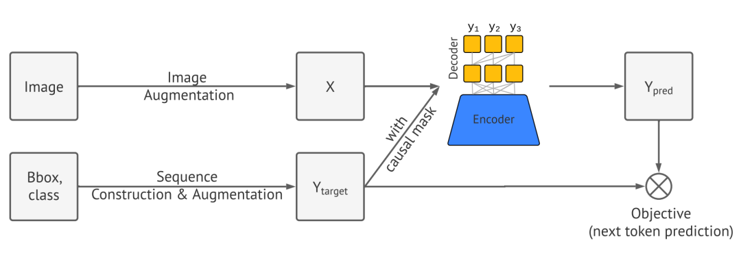 在 inference 阶段,我们根据条件概率对下一时刻的 token 进行采样,可以选择似然最大的 token, 但更好的方式是使用 Nucleus 采样,以提高召回率。最后,当得到 EOS 这个 token 的时候,结束生成,经过量化的逆操作得到 Bbox 和 Class.
