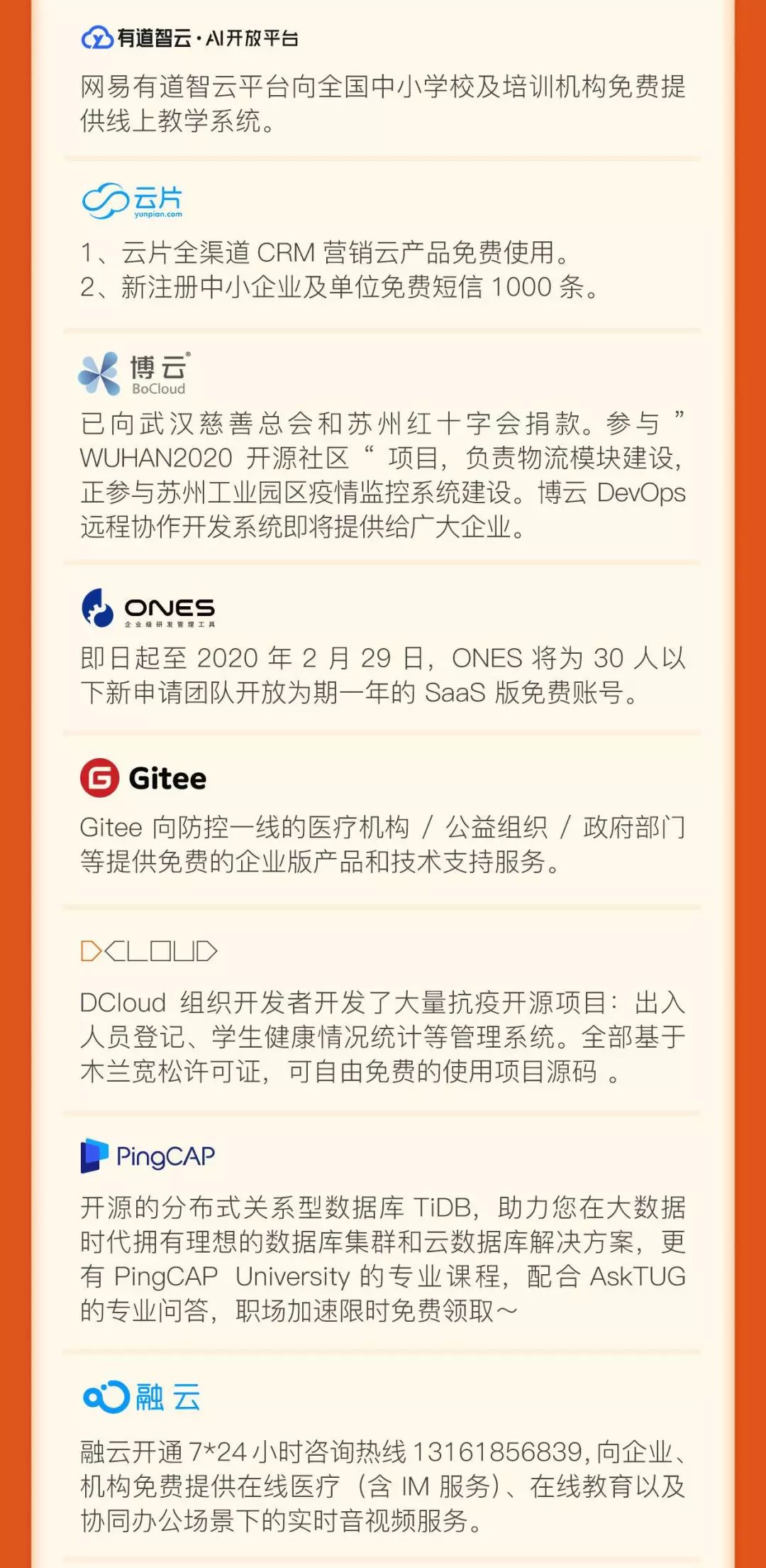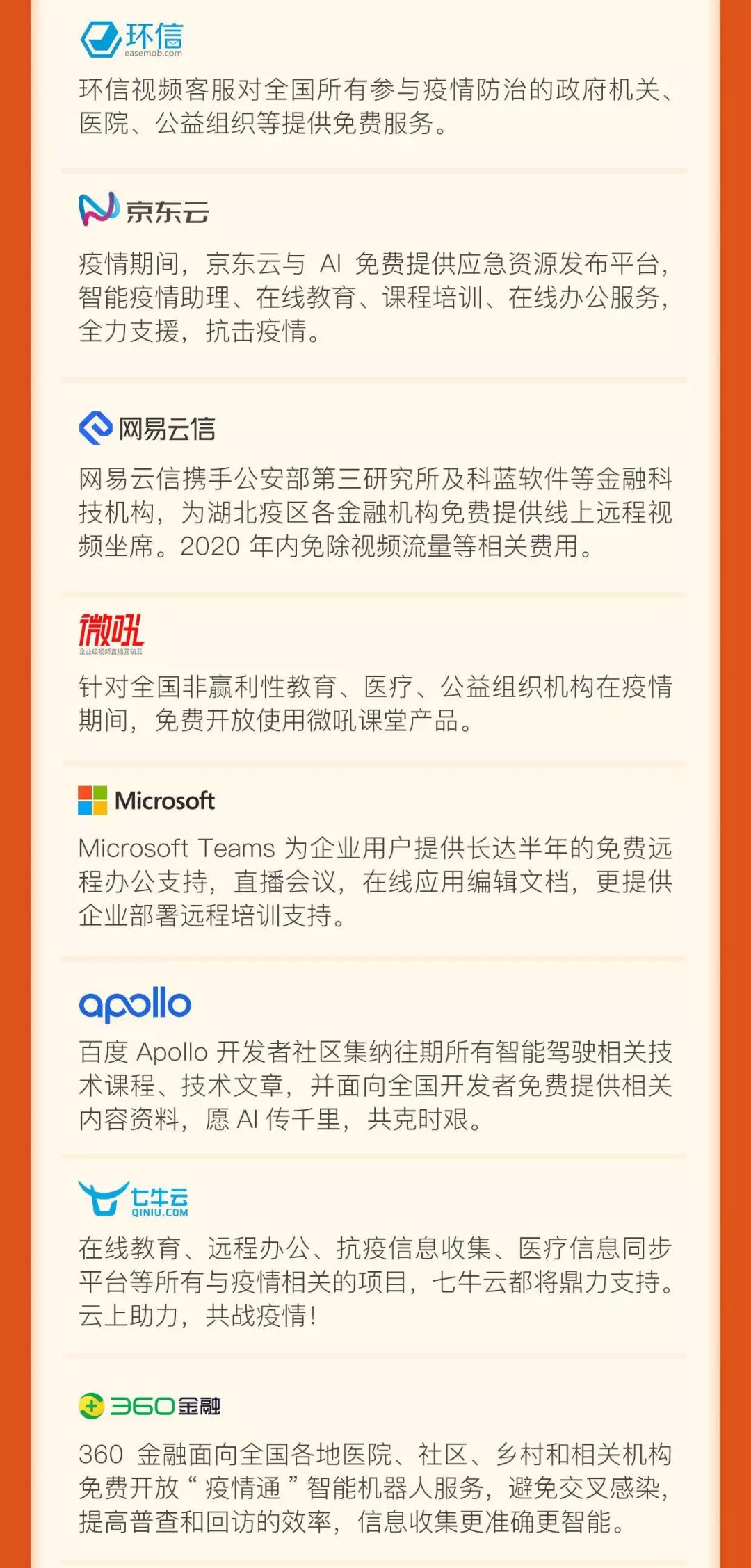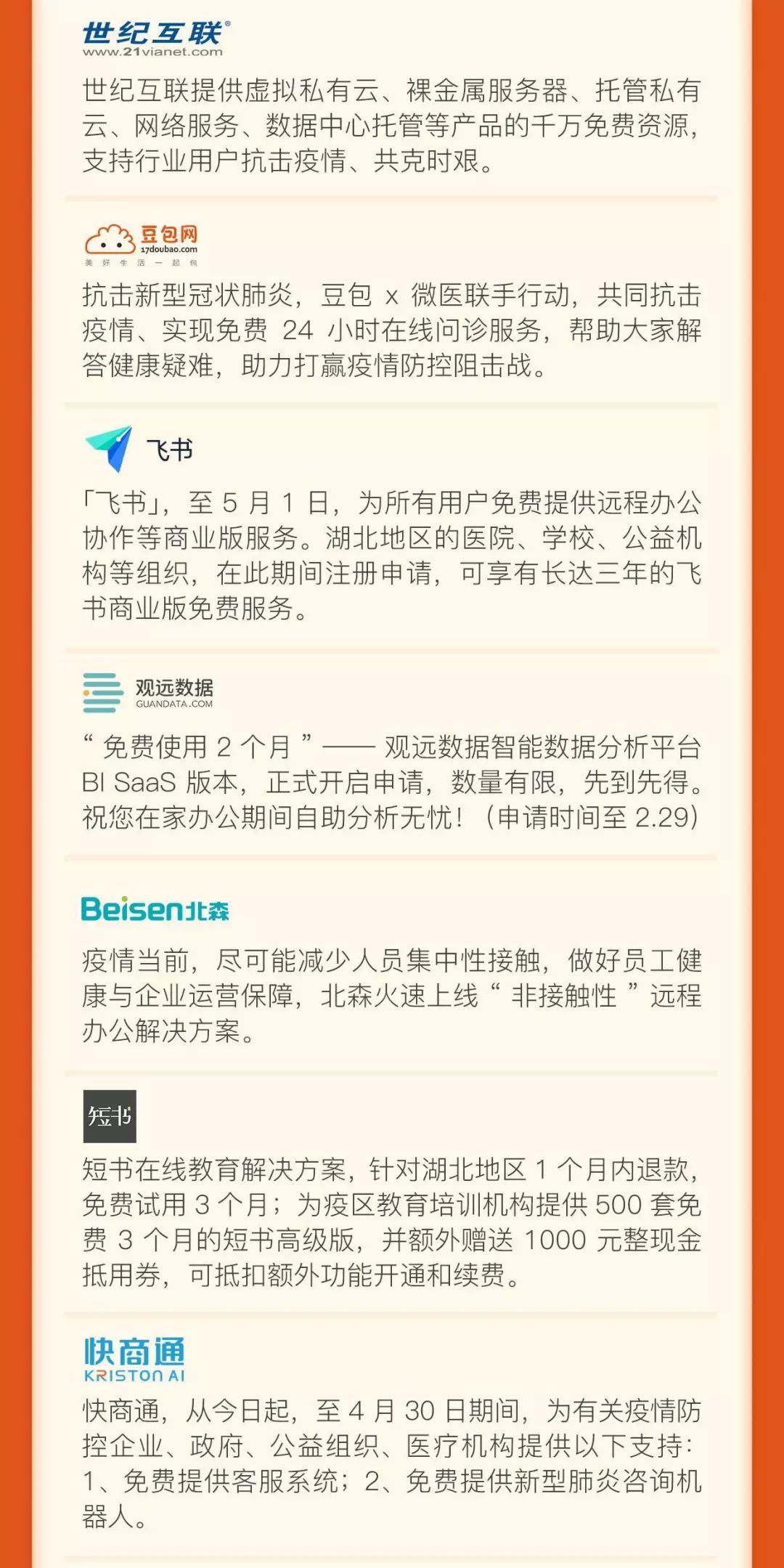 远程办公类:服务于有远程办公需求的企业和政府机构,包括免费的协同办公产品、在线办公服务、远程视频服务、直播会议服务、云计算资源等;