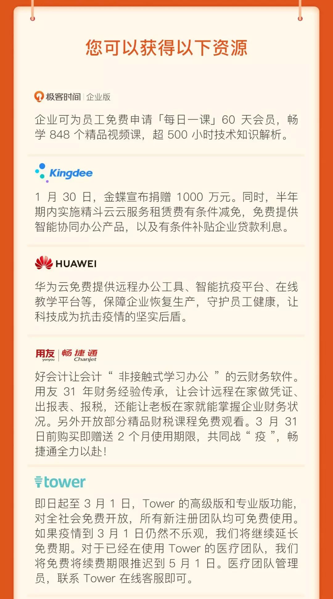 极客邦科技为此特别联合百家企业共同发起“抗击疫情企业联合行动”,向社会各界有 ToB 业务扶持、远程办公、在线医疗、在线教育等需求的企业和个人,提供工具类、平台类、产品类、资源类、知识服务类公益支持。让我们众志成城,共渡难关。