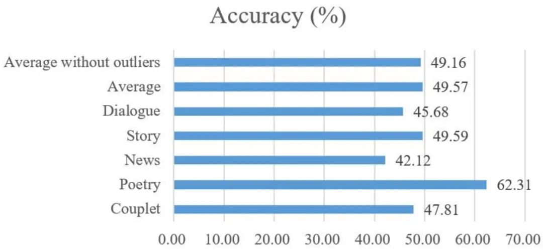 具体地,浪潮任意选择了源 1.0 生成的 24 篇文章,包括 4 副对联、5 首中文传统和现代诗歌、5 篇新闻文章、5 个故事和 5 段对话。其中,对联、诗歌和对话的创作被视为短文本任务,新闻和故事生成被视为长文本任务。与这些对比的人类创作的文章出自名家所作的诗歌、经典小说、搜狐新闻的新闻文章和 LCCC-large 数据集中的对话。对此,浪潮共收集了 83 份有效问卷。