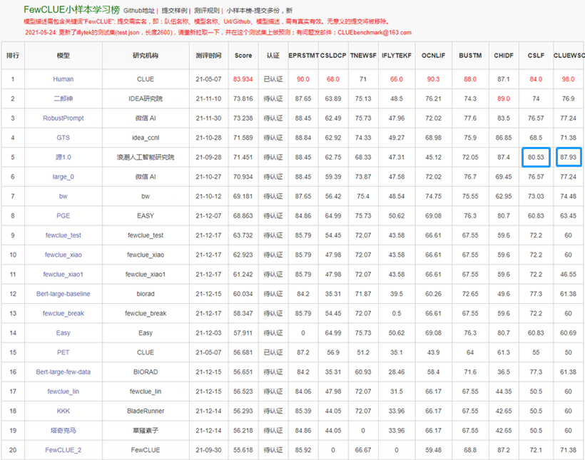 在 FewCLUE 小样本学习榜中,源 1.0 在文献摘要识别(CSLF)和名词代词关系(CLUEWSCF)两项任务上摘得榜首。