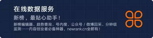◆新榜号内搜(关注公号“新榜服务”,在菜单栏即可领取),继续为超过万计的公众号提供免费的历史文章搜索和文集创立服务,包含用户访问数据的实时分析和热词引导的付费升级版,也持续受公众号管理和运营者的青睐。上周, “育娃号外”、“心连心月嫂”、“妈咪OK”等母婴类公众号,“创意社”及“超级美工”等设计类公众号选择了升级,并在菜单栏接入新榜号内搜。