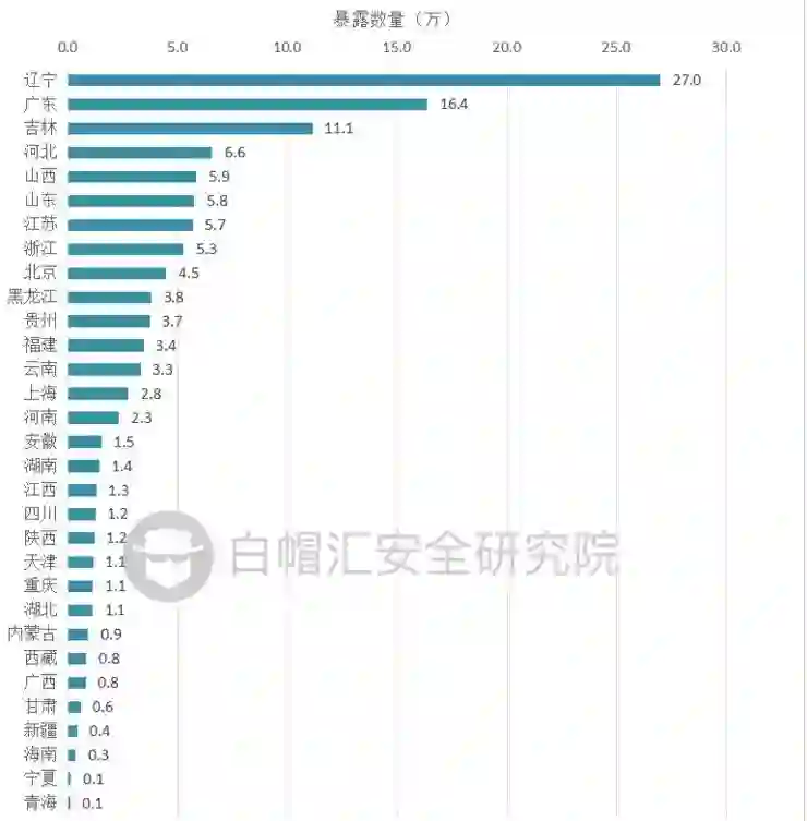视线转回国内,摄像头暴露情况同样不容乐观,辽宁第一、广东省第二、吉林省第三、河北省第四。第一暴露的辽宁省达到27万。