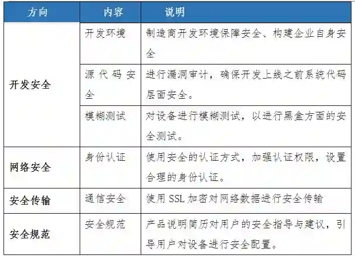 而对于摄像头制造商来说,除针对摄像头的设备的特点进行针对性防护外,还需要在整个业务系统从研发、上线、报废的生命周期内实施生命周期的安全管理。确保安全管理体系可以覆盖业务节点,实现及时发现每一环节中引入的漏洞等安全问题。