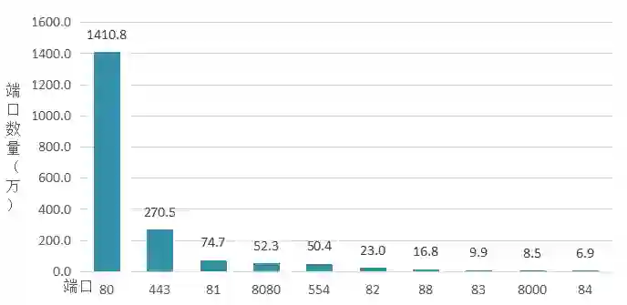 就摄像头设备暴露的网络端口而言,80端口数量最多,共有1410万,约占80%,443端口第二,共有270万,约占12%;81端口第三,共有75万,约占3%,8080端口第四,共有52万,约占2%;554端口第五,共有50万,约占2%;其他端口约占1%。