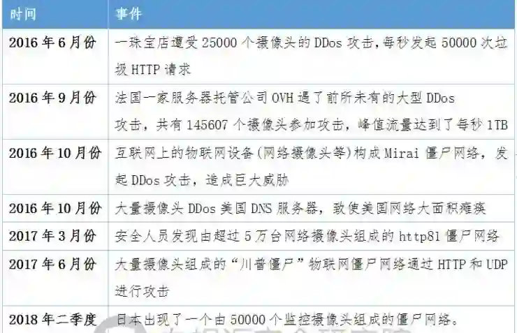 2016年9月,OVH遭遇了每秒1TB的DDos攻击。黑客通过入侵数万个CCTV摄像头,打造了一个含有145607个摄像头的僵尸网络。黑客就是通过这一网络同时向同一个地址发送数据包,很轻松地完成了一场TB级别的DDos攻击。