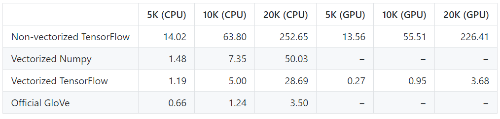 我们使用大约 90% 稀疏的随机生成的共现矩阵来比较各种词汇每个时期速度(以秒为单位)。正如我们在这里看到的,在 GPU上 运行时,其性能与官方用 C 语言实现的版本(https://github.com/stanfordnlp/GloVe)相比具有竞争力。