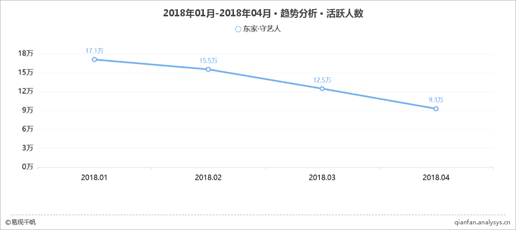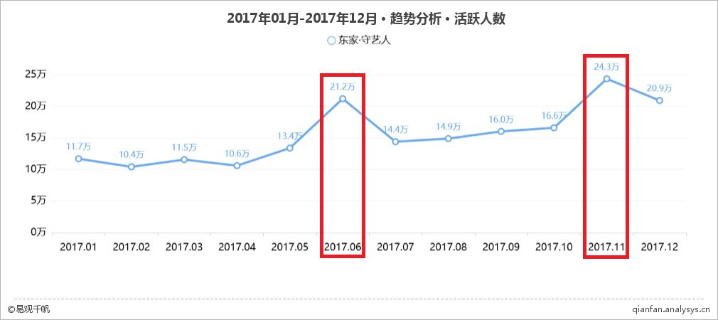 2017年6月,东家推出声势浩大的逛窑活动,汇集亚洲20个知名窑口,100多位优秀匠人,匠心造瓷、一起淘器。易观千帆数据监测显示,当月APP活跃人数跃升至21.2万,环比增幅58.5%。