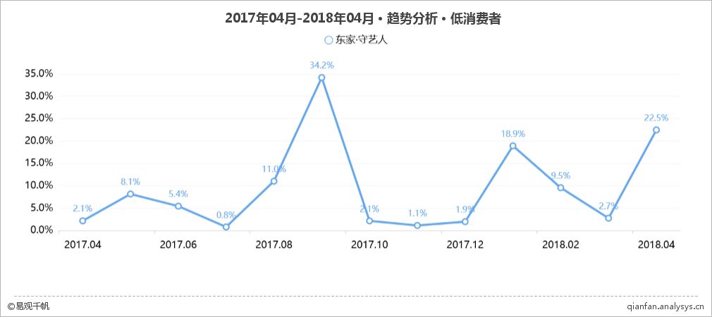 有意思的是,从消费能力分布来看,东家APP低消费者用户比例虽然波动较大,但总体上仍占一定地位;中低和中等消费者也较多。综合用户画像来看,表面上比较小众冷门的东家APP,实际受到了各个年龄段不同消费能力人群的关注。由此可见,在传统文化和匠人精神这些日渐主流的情怀感召之下,大众对文化艺术品的审美需求普遍提升,对大隐隐于市的匠人们的关注度也明显增长。在这一背景下,东家APP提出要打造文化生活平台,在做电商之外,用有质感、有格调的专业东方美学内容吸引了各种类型的用户,为自身持续增长储备了潜在市场。