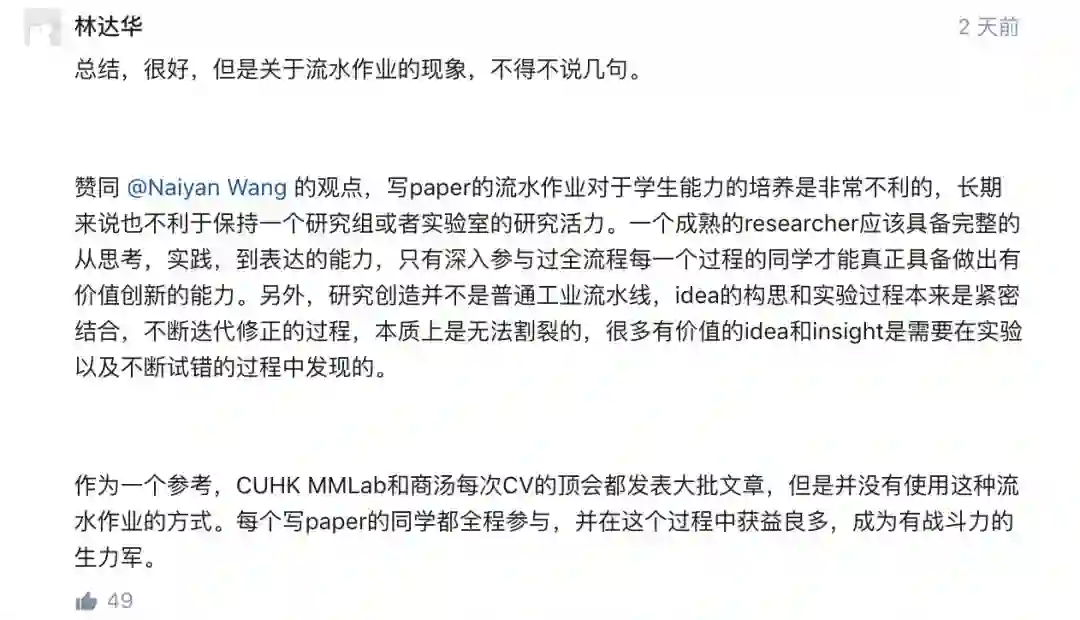 #关于文中提到的分工写 paper 的现状,图森未来首席科学家王乃岩和商汤科技联合创始人林达华也发表了自己的观点。他们认为,这种流水线作业对学生成长是不利的,一个好的科研人员需要有独立做研究的能力,只有全程参与,才能成为有战斗力的生力军。