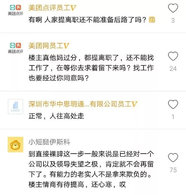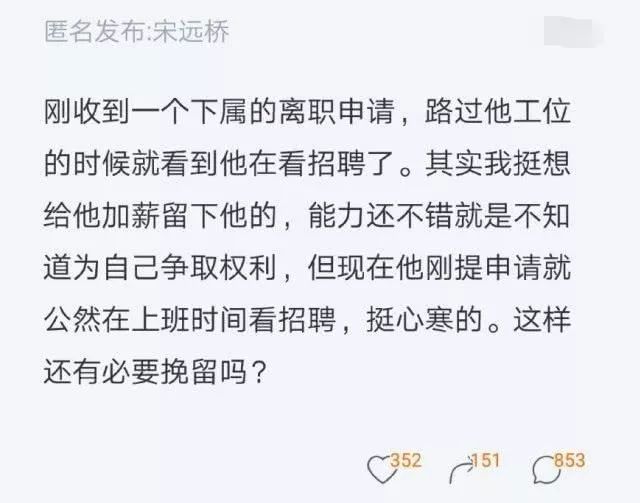 还有网友认为:从成本的角度上来看,加钱或许还有挽留的机会!但是还有网友剖析得比较全面:程序员的工作本来就忙,甚至不惜天天加班到深夜!而他对公司是有多失望才会在上班时间看招聘?而且作为领导竟然不知道为员工某福利就算了,竟然还以局外人的心态对他表示心寒?可能员工对你早就寒心了!