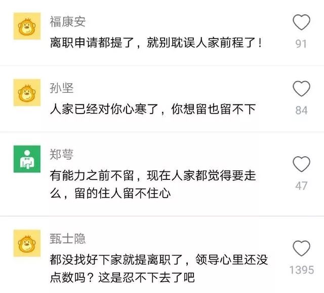 有网友疑问:既然知道他有能力,为什么在离职之前不留下他?现在人家走的时候觉得要留下,没用!之前留住的是心,现在可能连人都留不住,真能留下就是耽误了他的前程!