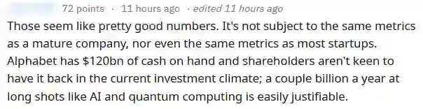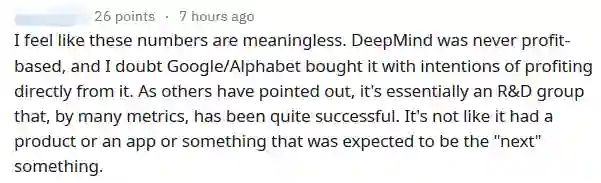 这些财务数字看起来太正常不过了。与成熟公司以及大多数创业公司不同,DeepMind 不必遵循一些特定的财务指标。Alphabet 现金流高达 1200 亿美元,并且在当前的投资环境下,股东们也不急于获得投资收益。所以,每年在人工智能和量子计算等长期项目上投资数十亿美元再合理不过了。