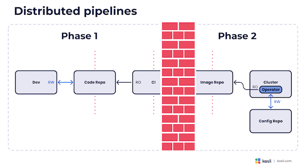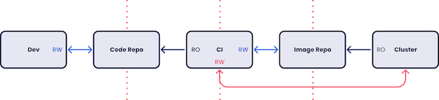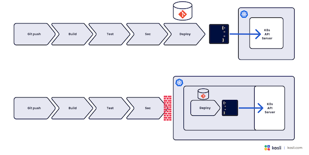 首先,我们来看看安全性。与简单地向集群推送变更相比,“基于拉取”的方法的好处是什么?它的主要优点是 CI 服务器不需要生产访问权限,因此我们可以说这提高了安全性。