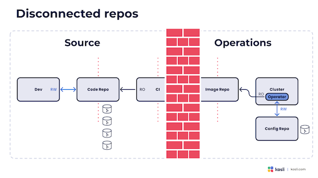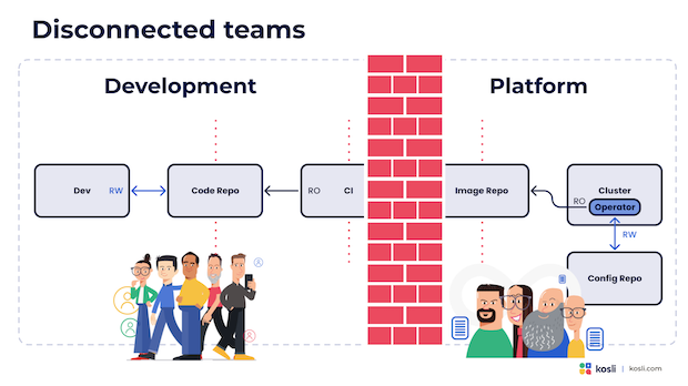 使用单独的配置存储库来保存系统状态将进一步扩大团队之间的差距: