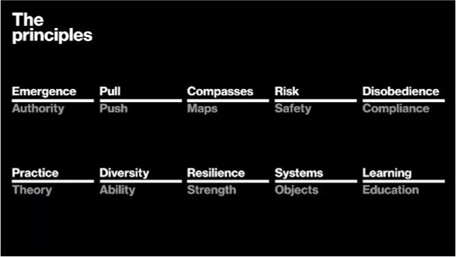 然而,伊藤穰一更像是一个社会实践者。他总结了9大原则:涌现优于权威、拉力优于推力、指南针优于地图、风险优于安全、违抗优于服从、实践优于理论、多样性优于能力、韧性优于力量以及系统优于个体。