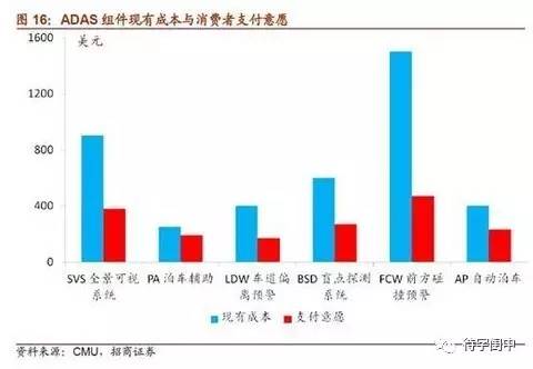 现在主要的ADAS组件如全景可视系统、泊车辅助、车道偏离预警、盲点探测系统、前方碰撞预警、自动泊车等等,现有成本与消费者支付意愿仍然有一定差距,仍然需要出货量和时间两大因素去消化。