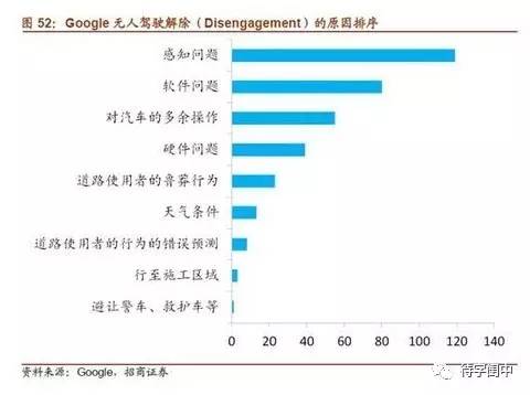 Google无人驾驶解除(Disengagement)的原因排序前五的是:感知问题、软件问题、对汽车的多余操作、硬件问题、道路使用者的鲁莽行为。
