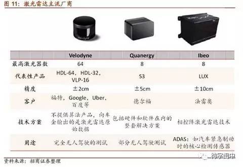 (1)激光雷达的主流厂商有Velodyne、Quanergy、Ibeo等公司