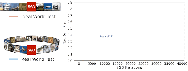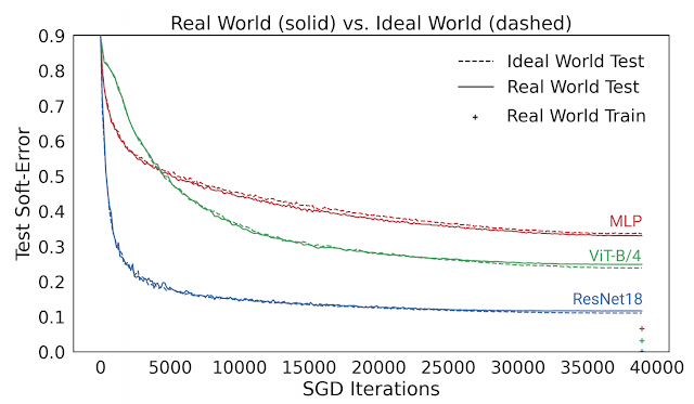 我们从中得出一个重要的观察结果,即直到现实情况开始收敛前,现实情况和理想情况下的模型在所有时刻的测试误差都非常接近(训练误差 < 1%)。因此,我们可以通过研究模型在理想情况下的行为来理解它们在现实情况下的表现。