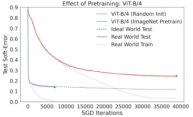 例如, 预训练在实践中通常用于促进小数据体系中的模型泛化。然而,人们对预训练发生作用的机理知之甚少。我们可以使用 Deep Bootstrap 框架,通过观察预训练对上述两方面形成的影响研究这个问题。我们发现,预训练的主要作用是促进理想情况的优化 (1),即使网络能够“快速学习”在线优化。预训练模型泛化能力的增强几乎总能带来其在理想情况下优化能力的提高。下图比较了使用 CIFAR-10 训练的视觉 Transformers (ViT) 在 ImageNet 上从零开始训练和预训练之间的差别。